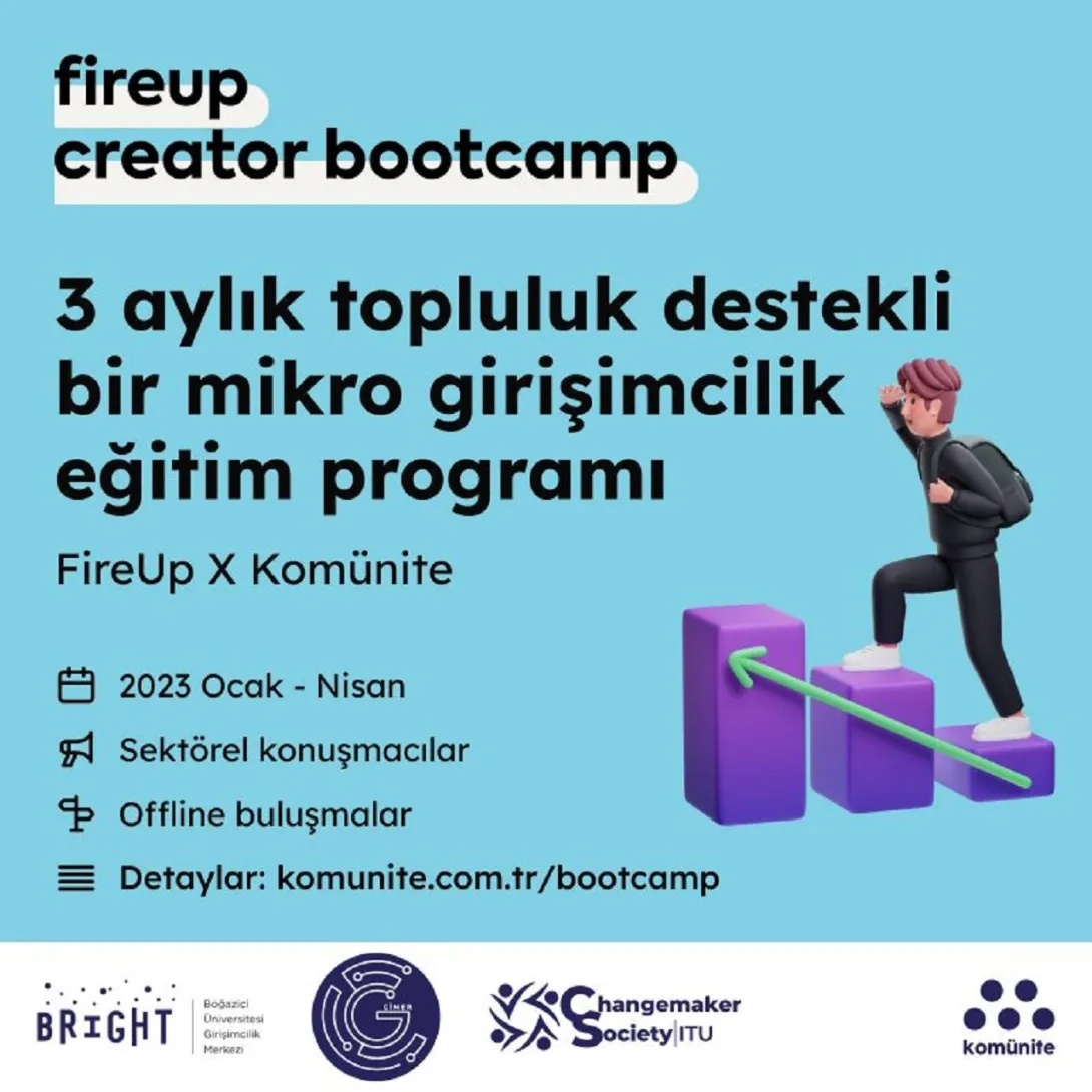 Boğaziçi Üniversitesi Girişimcilik Merkezi BRIGHT, ODTÜ Girişimcilik Araştırma ve Uygulama Merkezi (GIMER) | METU Entrepreneurship Research Center, ITU Changemaker Society ve Stanford Üniversitesi Hasso Plattner Institute of Design (d.School) işbirliğinde gerçekleştirilen FireUp Phase I Değişim Öncüleri Programı'nın, Komünite.com.tr partnerliğinde Phase II çalışması FireUp Creator Bootcamp başlıyor.